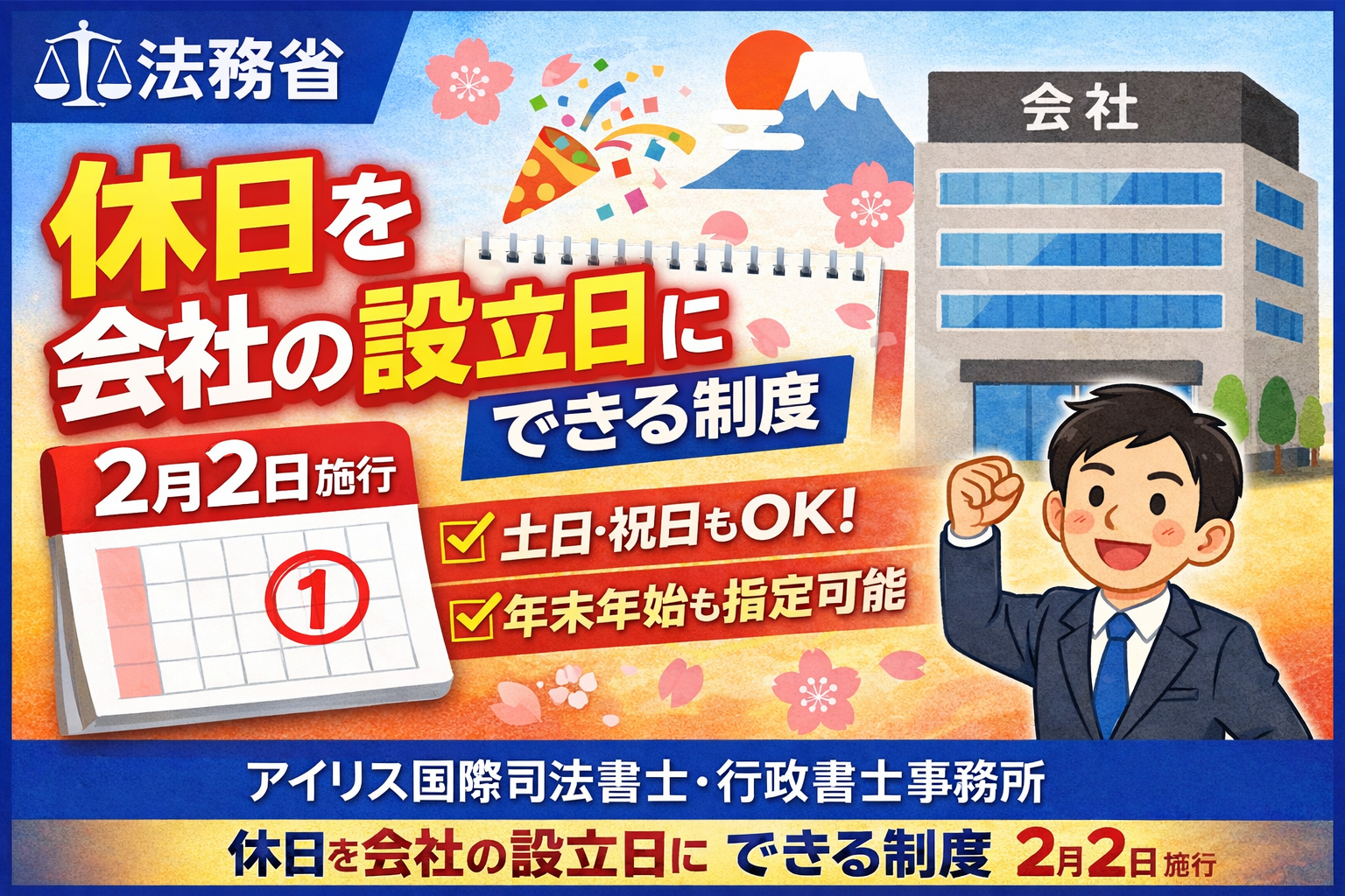法務省:休日を会社等の設立の日とすることが可能になりました(令和8年2月2日施行)