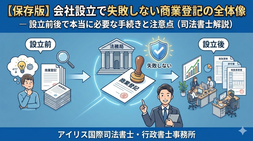 会社設立は「登記をすれば終わり」ではありません。商号や本店住所、事業目的の決め方を誤ると、銀行口座開設や取引開始で思わぬ支障が出ることもあります。本記事では、設立前から設立後まで、商業登記で本当に押さえるべきポイントを司法書士が体系的に解説します。